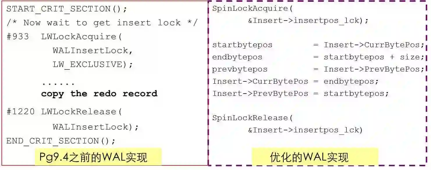 在PG9.4版本以前,就采用刚才那么一个粗放的形式,加一把大锁,然后临界区里面进行捣鼓,例如长度计算、拷贝日志、一些边界检查等。这个临界区的代码大概有300行左右。但后来他们发现这个模块的性能问题实在太严重了。