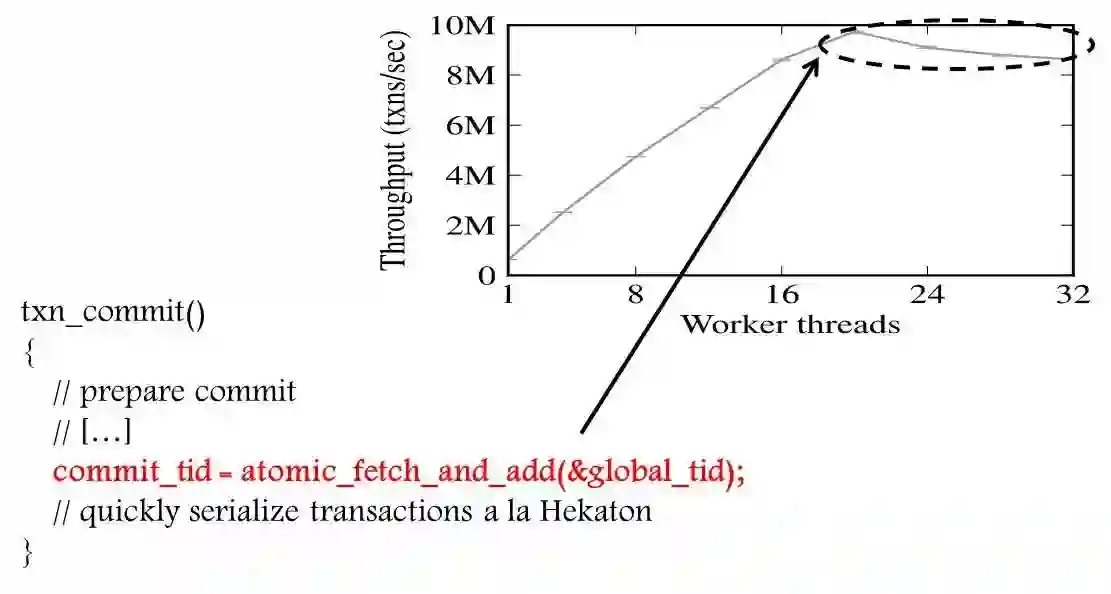 这是微软的内存数据库Hekaton的一个实验结果。截取了事务在提交时的一个时间戳。这个全局的原子操作都会导致这个性能的问题。但针对MySQL、PG这两种数据库,性能问题还远远轮不到像类似于这种原子操作来引发。