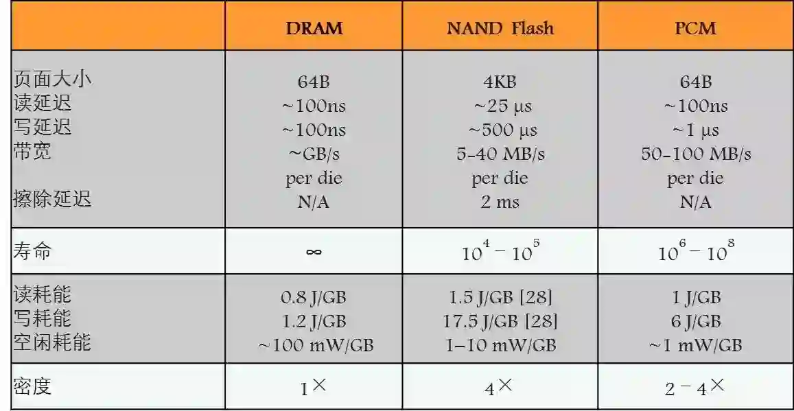 主要还是PCM的技术,是目前最为重要的一种技术。我们来看一下它的参数,这里主要是一些相关文献上摘取的数据,其中我们比较关注的是读写延迟、带宽、寿命,以及密度(容量)。