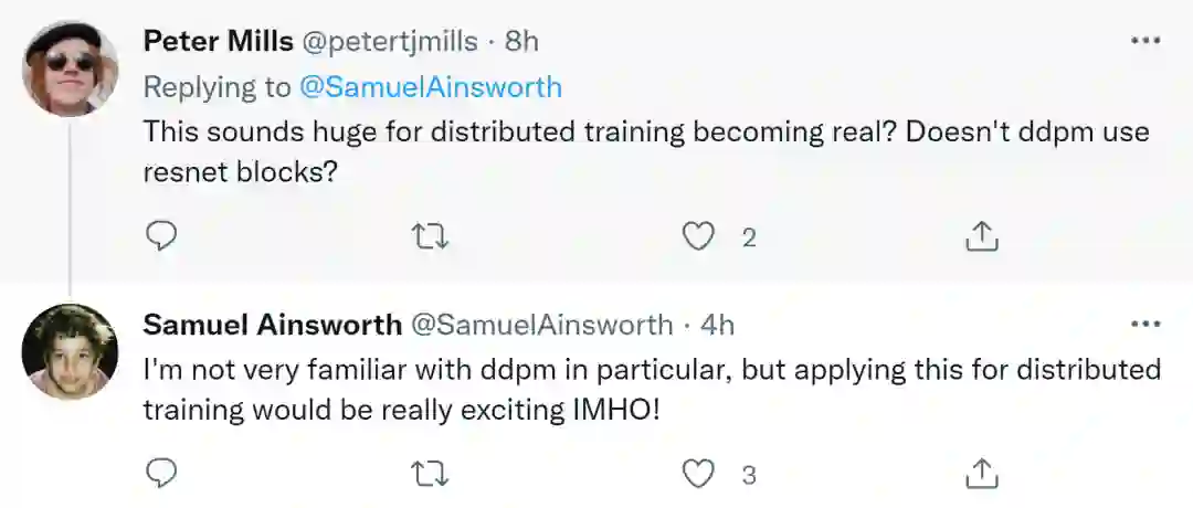 最后有人提出,「这看起来对分布式训练『成真』非常重要?难道 DDPM(去噪扩散概率模型)不使用 ResNet 残差块吗?」