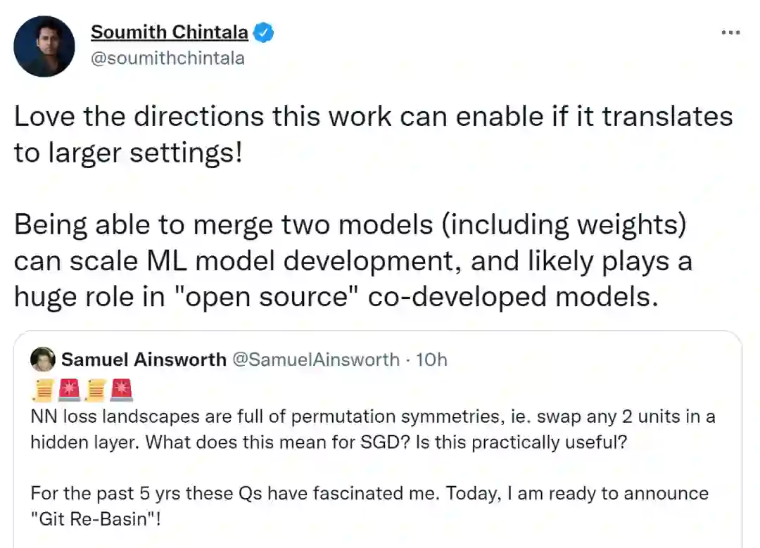 这篇论文在推特上引发了热议,PyTorch 联合创始人 Soumith Chintala 表示如果这项研究可以迁移到更大的设置,则它可以实现的方向会更棒。合并两个模型(包括权重)可以扩展 ML 模型开发,并可能在开源的共同开发模型中发挥巨大作用。