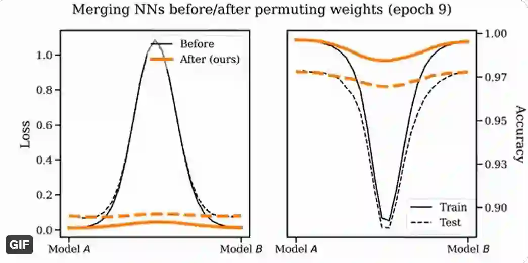 为什么会这样呢?2019 年,Brea 等人注意到神经网络中的隐藏单元具有置换对称性。简单的说就是:我们可以交换网络中隐藏层的任意两个单元,而网络功能将保持不变。2021 年 Entezari 等人推测,这些置换对称可能允许我们在权值空间中线性连接点,而不损害损失。