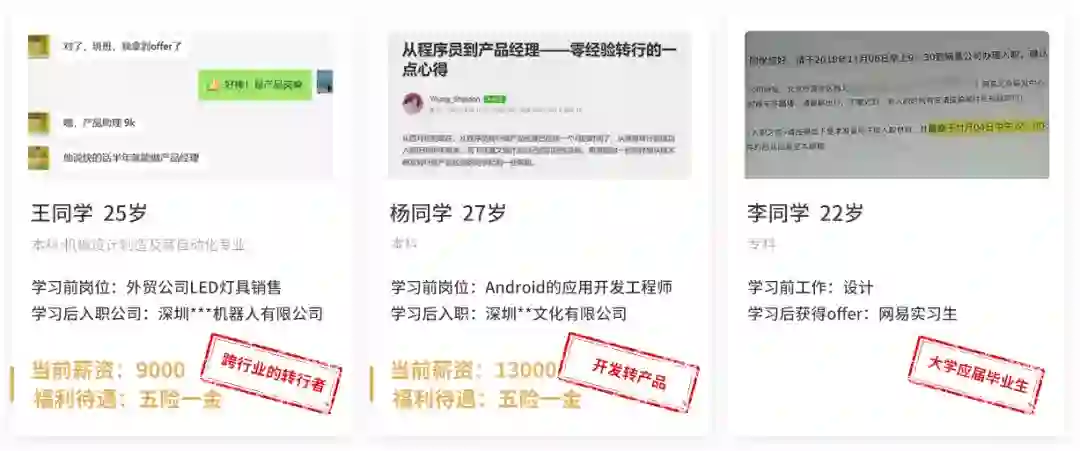 除了我以外,90天产品经理实战班还帮助过许多同学成功转岗入行产品: