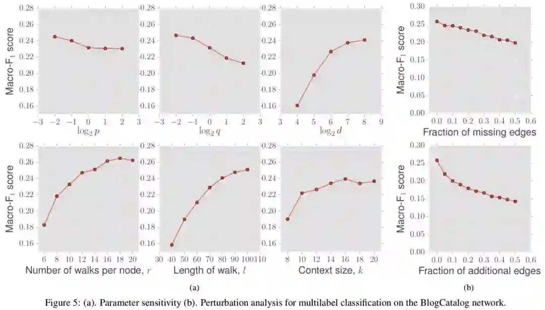 低 q 倾向于向外探索,低 p 倾向于在节点附近。d 包括 r, l, k。k 就是训练词向量时的窗口大小。最后一列的两幅图分别表示缺失边和随机边。
