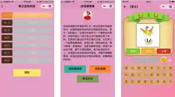这一时代的产品有两种代表类型,第一种是以《成语猜猜看》为典型代表的答题类产品。经典的玩法是:界面很很简单,玩法是从13年最火的《疯狂猜歌》、《疯狂猜图》那样的玩法直接复制过来的。可以答题的东西有:猜成语、猜歇后语、猜歌、猜诗词、猜明星。当你闯关的时候可以加金币,分享也能加金币,金币可以用来提示正确的答案帮助通过。