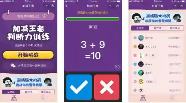 第二种是以《加减王者》等为代表的答题类产品。典型的套路:答对12道题,就可以获得娃娃奖励或者现金奖励。本质则是通过极小的成本物质奖励获取大量的的流量然后将流量导给公众号。