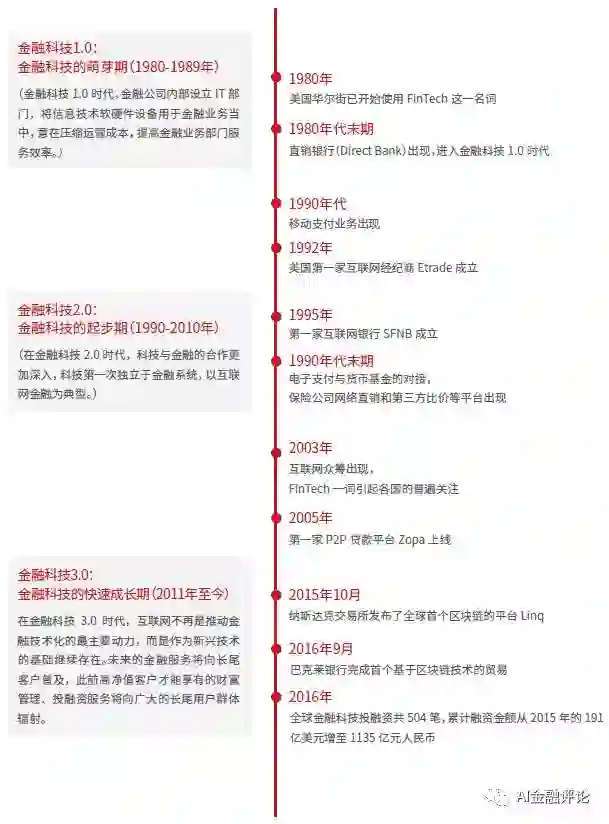 报告借用国际证监会组织(IOSCO)于2017 年2 月发布的《金融科技研究报告》中对金融科技的定义——金融科技是指“有可能改变金融服务行业的新兴科技和创新商业模式”,从新兴科技和创新商业模式演进两个方面,将金融科技的发展历程分为1.0、2.0、3.0三个时期,刻画出金融科技大致脉络: