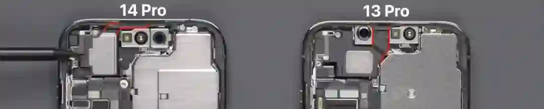 从硬件堆叠来看,之所以 Face ID 区域在这一代能进一步缩小,不是因为 Face ID 硬件变小了,而是 Apple 把距离传感器放在了屏下,并且更改了扬声器导音孔的位置,13 Pro 之前,导音孔是直接从 Face ID 中间贯穿,14 Pro 改成了从 Face ID 和上边框之间穿过,所以 Face ID 才会整体下移,总的来说就是,他要变小,一定得下移。