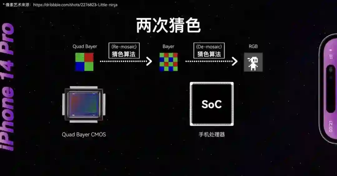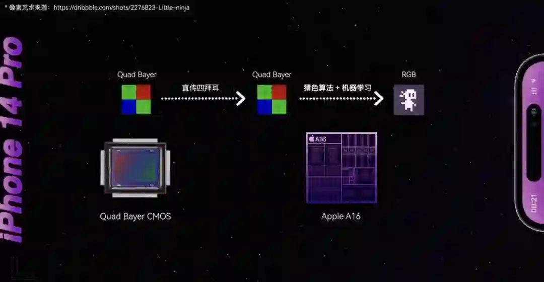 楼斌老师的拆解对比,红线就是导音孔的位置,虽然导音孔变细了,但是这代音质还是有提高,也不知道他们怎么搞的。并且在 16.1 beta 版本上,单手模式还可以把灵动岛一起拉下来,虽然我是觉得这样有点丑陋,但是单手用确实更容易了,这不也进一步的证明,灵动岛本身就是奔着解决问题去的,根本不介意暴露这个孔的存在吗?我相信硬件的孔未来会越做越小,但是灵动岛依然会存在,因为他要解决的问题一直在,并且同样存在这个问题的还有 iPad,未来他展示信息的区域会越来越大,甚至当 Face ID 完全可以做到屏下的时候,这个岛就不限于是黑色的,完全可以根据内容定义不同的颜色,就像一个正常的小组件。等到那个时候,可能就是 iPhone 的最终形态了。其次我觉得灵动岛跟 TouchBar、3D Touch 这俩是完全不一样的东西,3D Touch 他是典型的先有了这个交互或者说技术,再去想配套场景的一个功能,他解决的问题是很模糊的,甚至我觉得有些根本就称不上是个问题,再加上学习成本很高,导致了有很多人用到最后,手机都换了还不知道什么情况下可以重按。为了做这期视频,我又看了一遍 6s 发布会,就直到今天我也感觉他展示的功能很迷惑而 TouchBar 的失败也是因为不知道专业用户真正需要什么,专业用户是非常依赖快捷键的肌肉记忆和习惯的,把功能区按键直接替换成可编程的触摸屏,对很多专业用户其实是在帮倒忙,产品价值公式放在这个场景,你的新体验减去学习和适应的成本,最后得到的很有可能是个负值。这些专业用户往往又是 Mac 生态中最核心的用户。所以这俩功能失败本质上还是产品定义的失败,不知道要解决什么问题,不知道要为谁解决。俞军老师这本书,牛逼的但是灵动岛不仅仅是一开始就把要解决什么问题说的很清楚,并且在纯功能角度,你获得了新的状态展示区域之后,并没有什么代价,他利用的空间,完全是用硬件体积的缩小换回来的。原本应该展示的时间、信号电量啥的,相比于之前的产品一个都没少,就给人感觉想的特别清楚,这样用户用起来也不会迷惑。这个图应该很清楚了至于说灵动岛能实现的功能,因为三方开发者的适配都要等到下个月 16.1 的正式版才能看到,我就不在这重复一遍音乐导航倒计时了,三方的适配才是灵动岛的重中之重。这里我有一个很有意思的想法,跟大家分享一下,就是我在游戏版本更新的时候,经常是等的不耐烦我就切出去干别的了,如果这时候游戏更新的进度可以上岛,更新完提醒我一下,我点击直接进入,这是一个非常连贯的体验,相当于给游戏加了一个全局的应用入口。不知道你们觉得我这个想法怎么样?反正我觉得还是很合理的,到时候看看有没有哪家这么做的。这个功能其实 ColorOS 闪回键做了,他们产品经理想的也是非常细的最后就是动效,可能这也是很多人感知最显性的部分,让灵动岛配得上灵动这个名字,如果看过发布会的朋友们,可能注意到了,今年发布会在讲 A16 的时候,特意提到了全新的显示引擎,除了可以实现 1Hz AOD 之外,他们还重点强调了为灵动岛的动画增加了全新的抗锯齿算法。这才是真的邪门的地方,因为如果不把灵动岛的一部分动画,固化在硬件中,这些非线性动画组合在一起,功耗是非常高的,安卓这边不是不能做,但是功耗肯定受不了。所以整套灵动岛的体验,不仅仅是软件和屏幕硬件的配合,还有 A16 算法的支持,就你真的不敢细想,因为如果你发现 Apple 可能在 3-4 年前就开始琢磨这个东西的时候,你不会说 Apple 牛逼了,你只会说它很可怕,他在软硬件上的沉淀,让你难以望其项背,所以我才在视频里说,这个功能充分体现了 Apple 深厚的软硬件整合能力。横跨四个一级部门做出的软硬件整合方案,时间进度同时匹配 14 Pro 落地,这事儿你能细琢磨吗?并且在纯软件体验很难构成差异化的今天,Apple 在软硬件整合方面的优势还在一点点扩大,不仅仅体现在灵动岛,还有今年的相机。▍相机那我在这还是不会讲太多实际的拍照效果。十一国庆我打算出去,带上这些旗舰机好好拍一下,节后回来专门做个影像的对比。这期我先做一点铺垫,讲讲 Apple 的 4800w 到底是怎么回事,跟安卓有什么区别?因为在我去年做 iPhone 13 Pro 相机解析的时候,我当时就看到很多弹幕在说,拿 Apple 1200w 像素跟安卓动不动 4800w 5000w 放大比清晰度是不是欺负人。所以啊朋友们,科普这件事还任重道远,大家还是得提高鉴别能力,得分清什么是营销噱头,什么是真正的体验提升。现在手机上用的 4800w 5000w 高像素,跟传统意义上在微单、单反的高像素,并不一样。手机上用的高像素传感器是四拜耳排列,说白了就是原本 1200w 像素的传感器,每个像素上横竖各切一刀,把一个像素分成四个。那这样做有什么好处呢?第一个他支持把切开的四个像素合在一起用,说白了,像素是个水杯,他要像装水一样把光装进来,四个像素合并成一个,杯子变大了,水容量也变大了,画质也就更好了,实际上各家的产品为了保证更好的画质,在自动模式拍的照片都是清一色的 1200w,并且这样处理器的压力也会小很多,计算时间短,拍照体验也更好。第二个像素分开用情况会稍微复杂一点,因为传感器其实可以输出两种高像素模式,第一种是针对不支持处理四拜耳排列的处理器,传感器可以通过猜色算法,先把四拜耳排列转换成拜耳排列,再由手机处理器经过一次猜色算法,把拜耳排列转换成 RGB