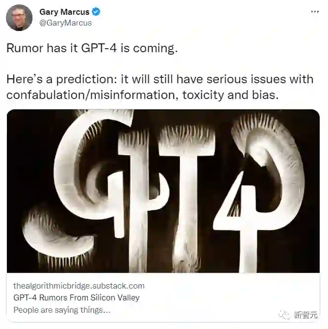 他在社媒表示:「有传言说GPT-4即将到来。下面我的预测:它仍然会存在严重的虚构/错误信息、毒性和偏见问题。」
