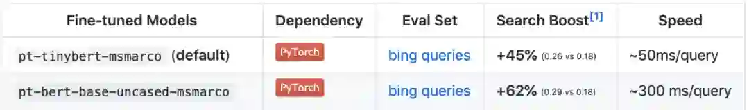 TinyBERT,虽然不如BERT Base有效,但我们的实验表明,它保留了BERT Base MRR分数的90%(0.26与BM25排名前50位的0.29对比0.29,而使模型快10倍,小20倍)。但是,基于学术基准(例如MS Marco)的结果通常缺乏现实世界的可概括性,因此应谨慎考虑。