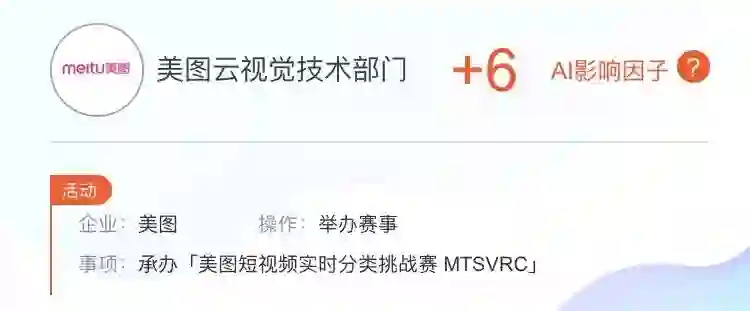 美图云视觉技术部门在雷锋网旗下学术频道AI科技评论数据库产品「AI 影响因子」中凭借 AAAI 2018 oral 论文获得相关加分,此次举办「美图短视频实时分类挑战赛 MTSVRC」同样有相应加分。