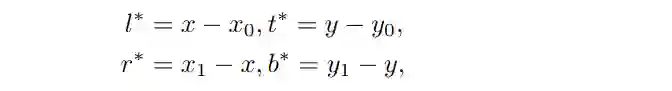 为了解决当预测的边界盒变得不可靠时,跟踪器会快速漂移的问题,我们引入了一种新的无锚回归来进行视觉跟踪。它将groundtruth边界盒中的所有像素都作为训练样本。其核心思想是估计目标对象内每个像素到groundtruth边界盒的四个边的距离。其中,设