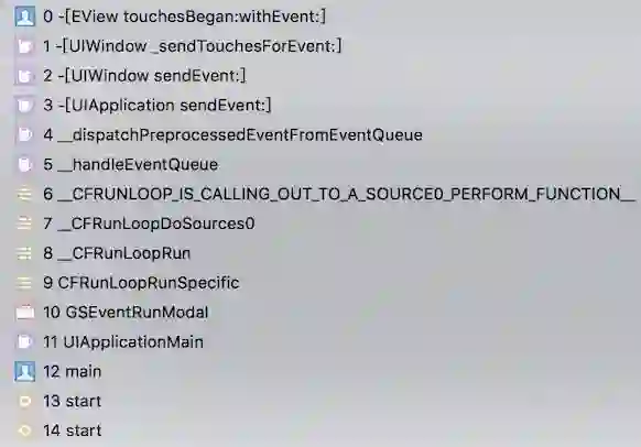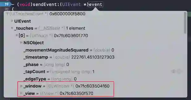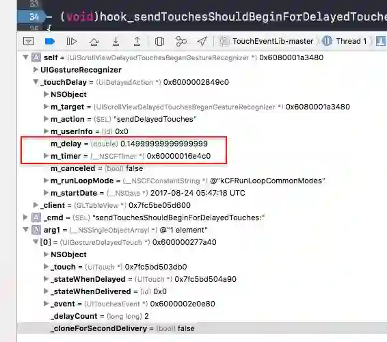 可以看到这个手势识别器的 _touchDelay 变量中,保存了一个计时器,以及一个长得很像延迟时间间隔的变量m_delay。现在,可以推测该手势识别器截断了事件并延迟0.15s才发送给hit-tested view。为验证猜测,我分别在Window的 sendEvent: ,hook_sendTouchesShouldBeginForDelayedTouches: 以及TableView的 touchesBegan: 中打印时间戳,若猜测成立,则应当前两者的调用时间相差0.15s左右,后两者的调用时间很接近。短按Cell后打印结果如下(不能快速点击,否则还没过延迟时间触摸就结束了,无法验证猜测):