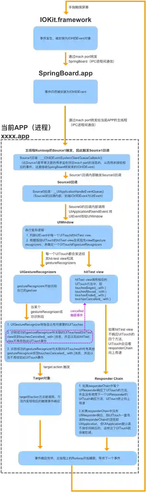 触摸发生时,系统内核生成触摸事件,先由IOKit处理封装成IOHIDEvent对象,通过IPC传递给系统进程SpringBoard,而后再传递给前台APP处理。