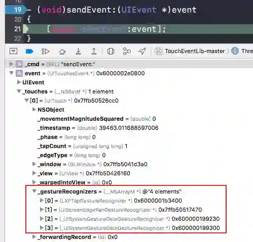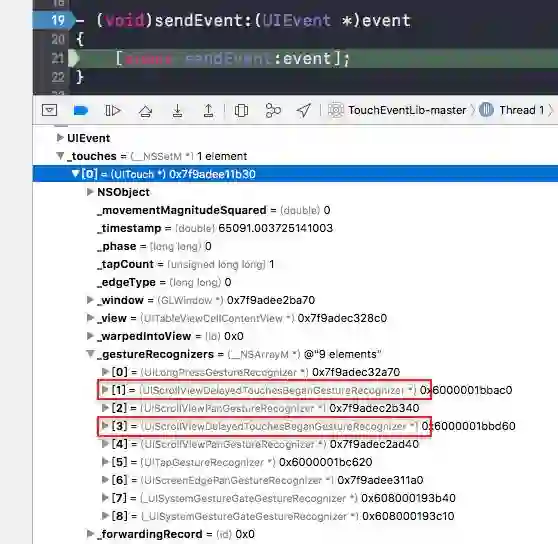 Window的 sendEvent: 打个断点查看event上的touch对象维护的手势识别器数组: