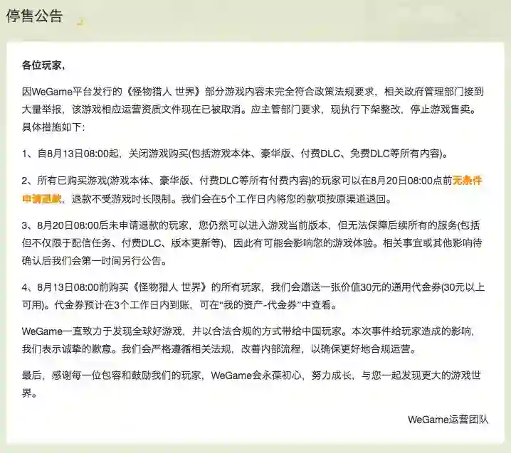 已经购买的玩家可以选择在8月20日8:00前无条件退款,此次退款不受游玩时间限制。8月20日8:00之后未退款的玩家,可以继续进入游戏,但无法保障版本更新等后续服务。8月13日8:00之前购买游戏的玩家,作为补偿将获得一张价值30元的代金劵。