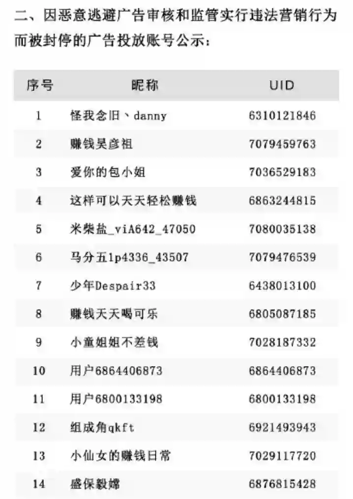 可同时,我们在微博官方的广告在线审核账号提供的违规营销公示处理上,可以看到有“逃避广告审核”这一条规则,基本每个月都会禁封五百个左右的违规账号。而从这些账号的名字中,不难发现他们也是“兼职广告”的发布者。而这一门类,在微博广告在线审核处理中占比最大,基本每个月处理600个违规账号,其中有100个都是兼职广告的发布者。
