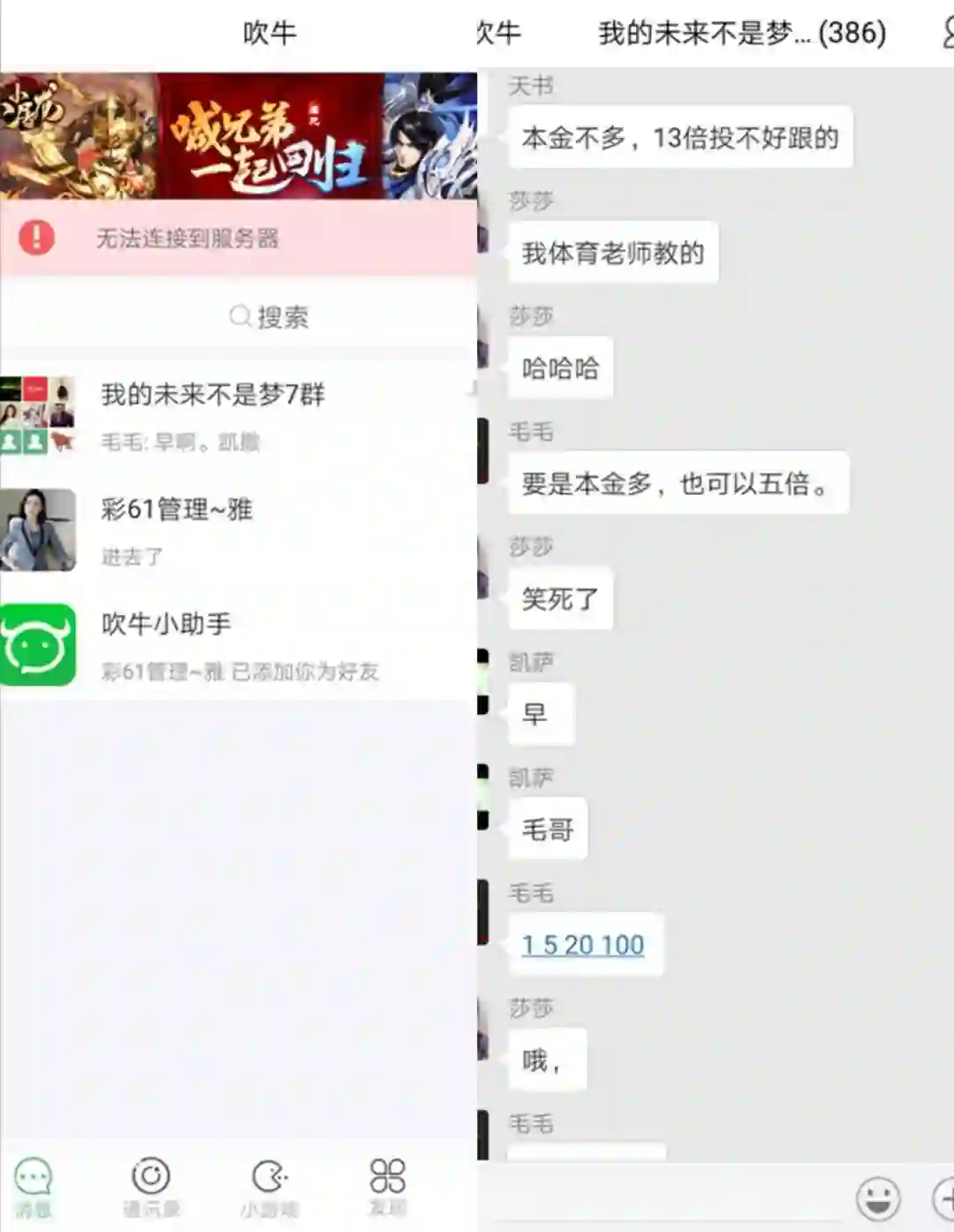 在吹牛App中,随处可见堆积成山的页游广告。吹牛上的导师将我们拉到了群里,群中非常活跃,常常有人欢呼着自己又赢钱了,并不断强调,只要本金够多,就可以赢来更多的钱。群内设置了不可添加群成员为好友的规则,我们很难去判断群里有多少“真人”有多少是机器人。