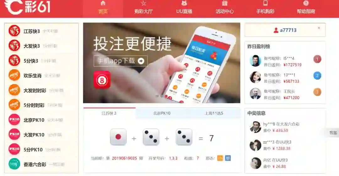 在他们提供的彩票网站上,我们能看到押大小、快三等等多种玩法。屏幕的侧边,滚动显示着来自XX地区的X先生中了XX元,不断地刺激着人们的神经。