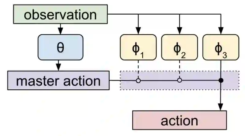 MLSH的整体结构是,如下图考虑一个两层的结构,上层的Policy(θ)输出Master-action选择输出下层Skills,下层的Skills(φ)输出真正的Actions。例如在蚂蚁的爬行任务中,Observation为地图和自身的位置,Actions为每一只脚的动作。通过一个两层的结构完成寻路任务并不算创新,MLSH的关键在于“Skills代表什么“是在过程中学习出来的。