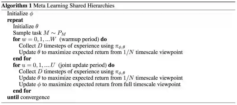 考虑一个马尔科夫决策过程 (MDP) 中的连续Action轨迹:a1, a2, a3 ... at。连续Action的抽象即是说,定义一个Skill,使用这个Skill就意味着输出这个Action序列:a1, a2, a3 ... at。自动学习连续Action的方法有使用类似EM方法的DDO[6],以及Meta-Learning Shared Hierarchies (MLSH)[7],接下来我着重介绍下MLSH的工作。