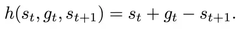 论文的主要思想如上图所示,首先从环境得到状态表示,高层μ(hi)在大时间尺度上作决策,低层μ(lo)在小时间尺度上做决策。高层决策时,生成一个目标交给低层,低层则不断通过Actions与环境交互去实现这个目标。图中的h是指的目标转移函数 (Goal Transition Function),定义如下: