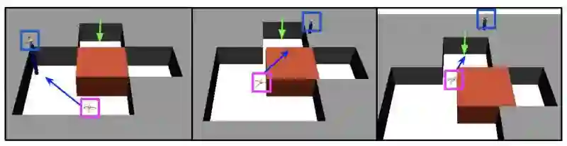 实验部分,文章搭建了一些更加复杂的环境,如下图所示,蚂蚁不仅需要学会爬行,还需要将红色方块向右推,以达到绿色标记的位置。下图中蓝色标记为高层的给出的目标位置。