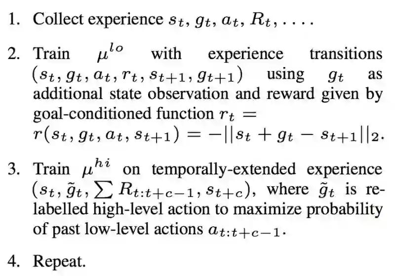 收集到Experience之后,使用Off-policy的方式分别训练高层和低层。低层的训练如图所示很明确了,高层的训练这里使用了一个目标重标记 (Goal Relabeling) 的Trick。因为考虑到在训练过程中,高层的数据来源并不是当前的低层,而是之前的低层,所以为了保持高低层训练的一致性,将目标重标记成最能够使得当前低层产生这些Actions的目标。