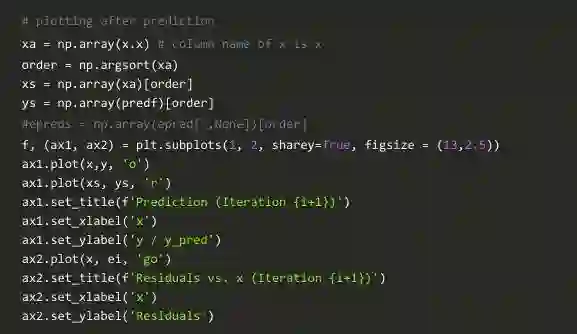 我们可以看到,即使在第50次迭代之后,残差对x的曲线看起来也与我们在第20次迭代中看到的相似。 但是,模型变得越来越复杂,预测过度的训练数据,并试图学习每个训练数据。 所以,最好是停止在第20次迭代。