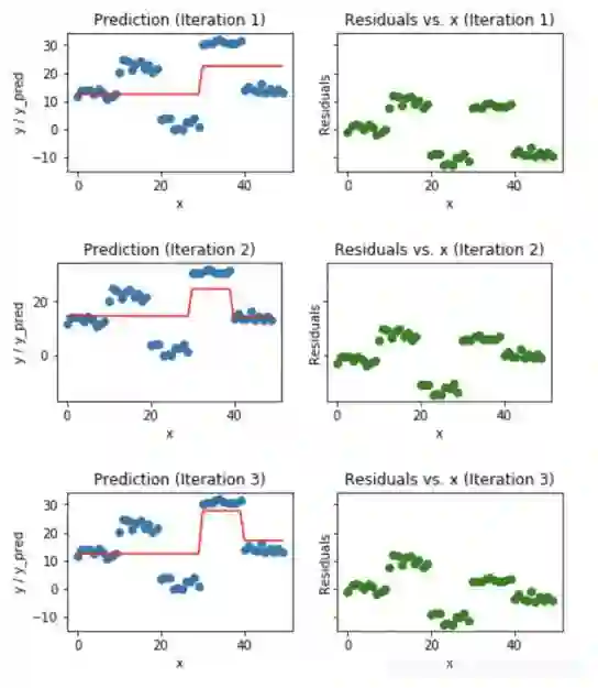 蓝点(左)是输入(x)与输出(y)的关系•红线(左)显示由决策树预测的值•绿点(右)显示第i次迭代的残差与输入(x)•迭代表示拟合梯度提升树的顺序。