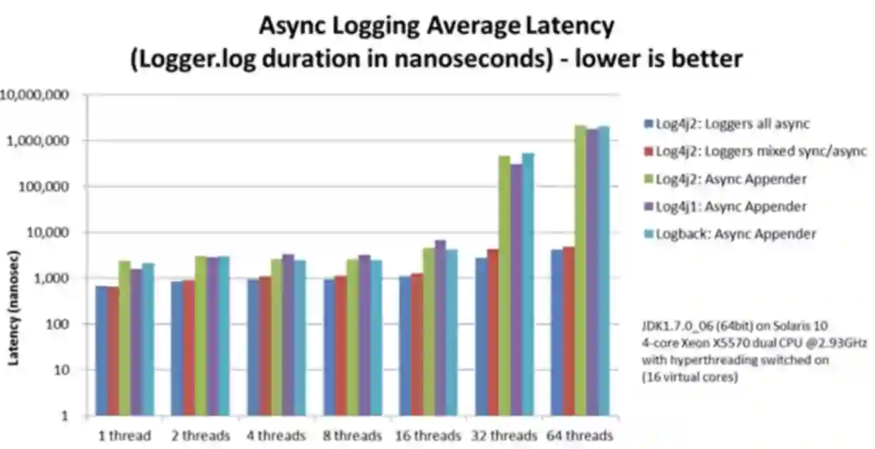 新的Log4j 2.0版本有了大幅的性能提升、新的插件系统,以及配置设置方面的很多改善。Log4j 1.x 在高并发情况下出现死锁导致cpu使用率异常飙升,而Log4j2.0基于LMAX Disruptor的异步日志在多线程环境下性能会远远优于Log4j 1.x和logback ——官方测试结果。
