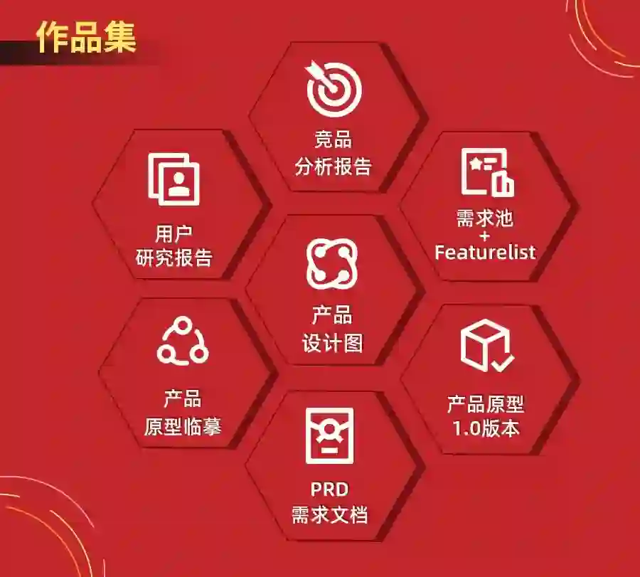 还可以是自己所做过的一些市场分析报告、需求池+FeartureList、流程图、架构图、原型、PRD等。突出表现出产品经理的基本技能及逻辑能力。