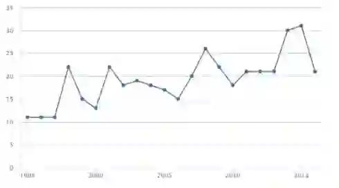 图:曹雪涛院士历年发表的高水平论文篇数