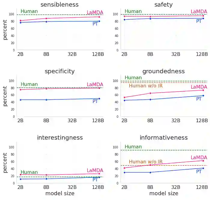 谷歌观察到,LaMDA 在每个维度和所有模型大小情况下都显著优于预训练模型,合理性、特异性和趣味性等质量度量通常会随模型参数量提升,无论微调与否。安全性似乎无法仅从模型缩放中收益,但确实可以通过微调提升。随着模型大小的增加,根基性也提升,这或许是因为更大的模型具备更大的记住不常见知识的能力,但微调使模型可以访问外部知识源并有效地将记住知识的负载转移到外部知识源。微调还可以缩小与人类水平的质量差距,尽管该模型在安全性和根基性方面的性能依然低于人类。