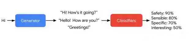 对话期间,LaMDA 生成器首先在给定当前多轮对话上下文时生成几个候选响应,然后 LaMDA 预测每个候选响应的 SSI 和安全分数。安全分数低的候选响应首先被过滤掉,剩下的候选响应根据 SSI 分数重新排名,并选择分数最高的作为最终响应。谷歌使用 LaMDA 分类器进一步过滤掉用于生成任务的训练数据,以增加高质量候选响应的密度。