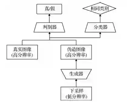 在SRGAN模型工作的基础上,增设类别分类器,并将类别损失项添加至生成网络损失中,再利用反向传播训练更新网络参数权重,以实现对SRGAN模型损失函数与网络结构的优化。主要工作包括: