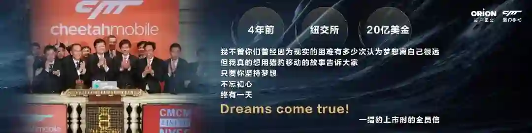 敲钟那一天,我按动手上的电铃,看着百年历史的纽交所交易厅,因为猎豹移动而开始工作,我满心感慨。上市当天,我给全员写了一封信,我说:“我不管你们曾经因为现实的困难有多少次认为梦想离自己很远,但我真的想用猎豹移动的故事告诉大家,只要你坚持梦想,不忘初心,总有一天,dreams come true!”