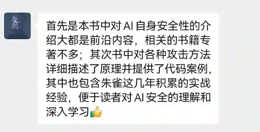 攻与防永远是螺旋式上升的态势,“AI安全”仅仅才是开始,我推荐本书给每一个安全从业者。除此之外,我一直认为最优秀的程序员一定懂得如何写出安全的代码。因此,我也推荐本书给每一位AI从业人员,一起致力于打造出安全的AI。