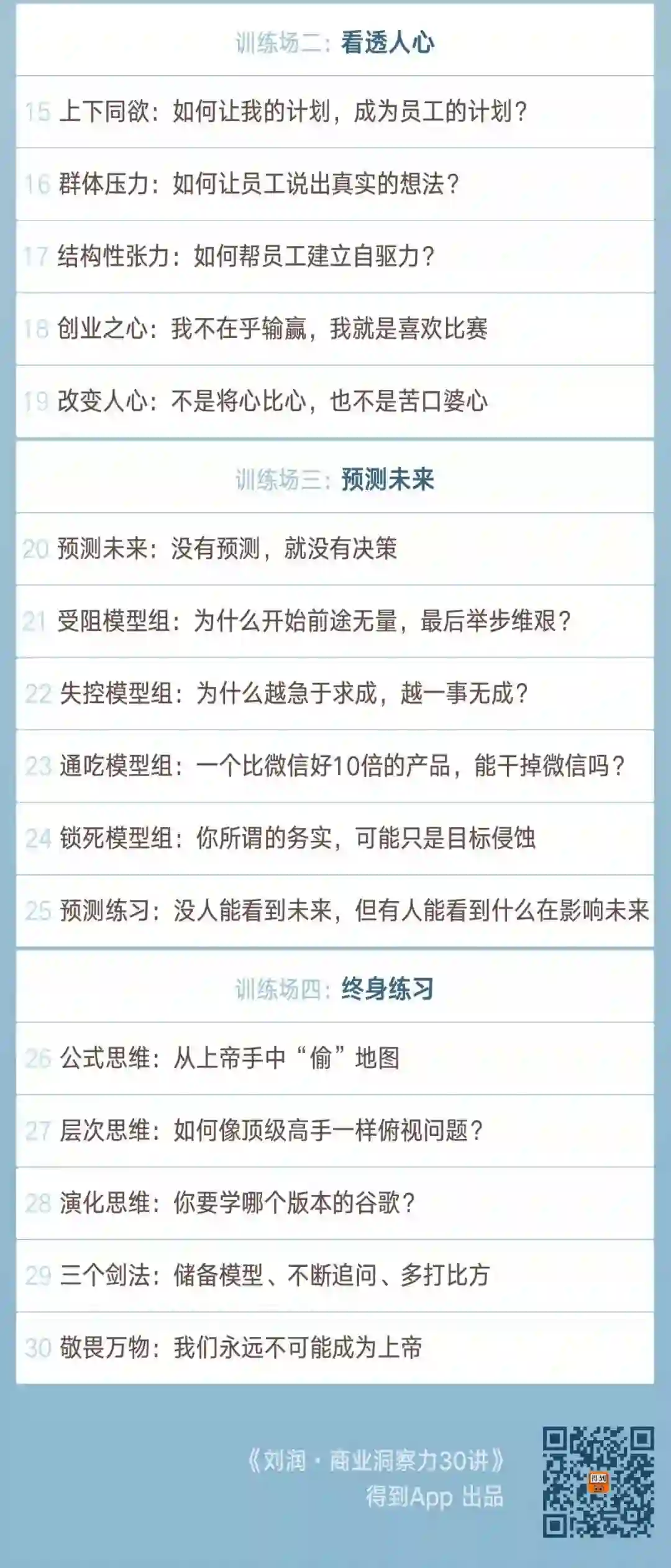 训练场四:终身练习。洞察力不是一朝一夕就能练成的,刘润会带你破除顽固的三大思想误区,给你终身修炼的秘笈,然后目送你下山。