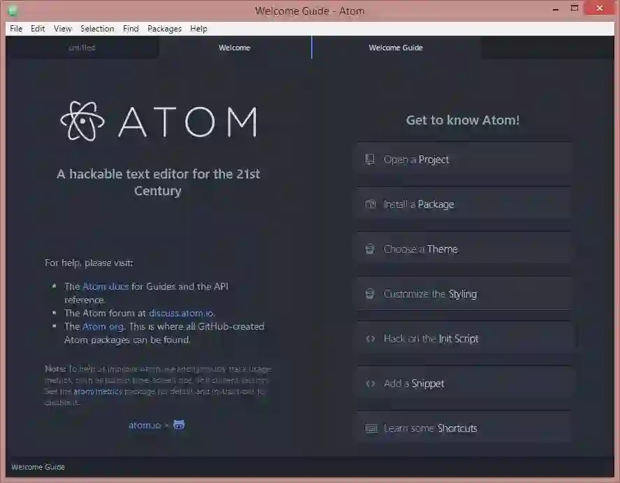 Atom 是最受欢迎的文本编辑器之一。Atom 开发者称之为二十一世纪的“可魔改”(hackable)文本编辑器。Atom 是开源的,支持跨平台。在内置的包管理器,支持 AngularJS、智能自动完成、Atom TypeScript、Jshint 以及 turbo-JavaScript 这些功能的辅助下,Atom 对于快速的 Web 开发有很大的帮助。Atom 还具有简洁和直观的图形用户界面,并有很多有趣的特点:支持 CSS,HTML,JavaScript 等网页编程语言。它支持宏,自动完成分屏功能,集成了文件管理器。