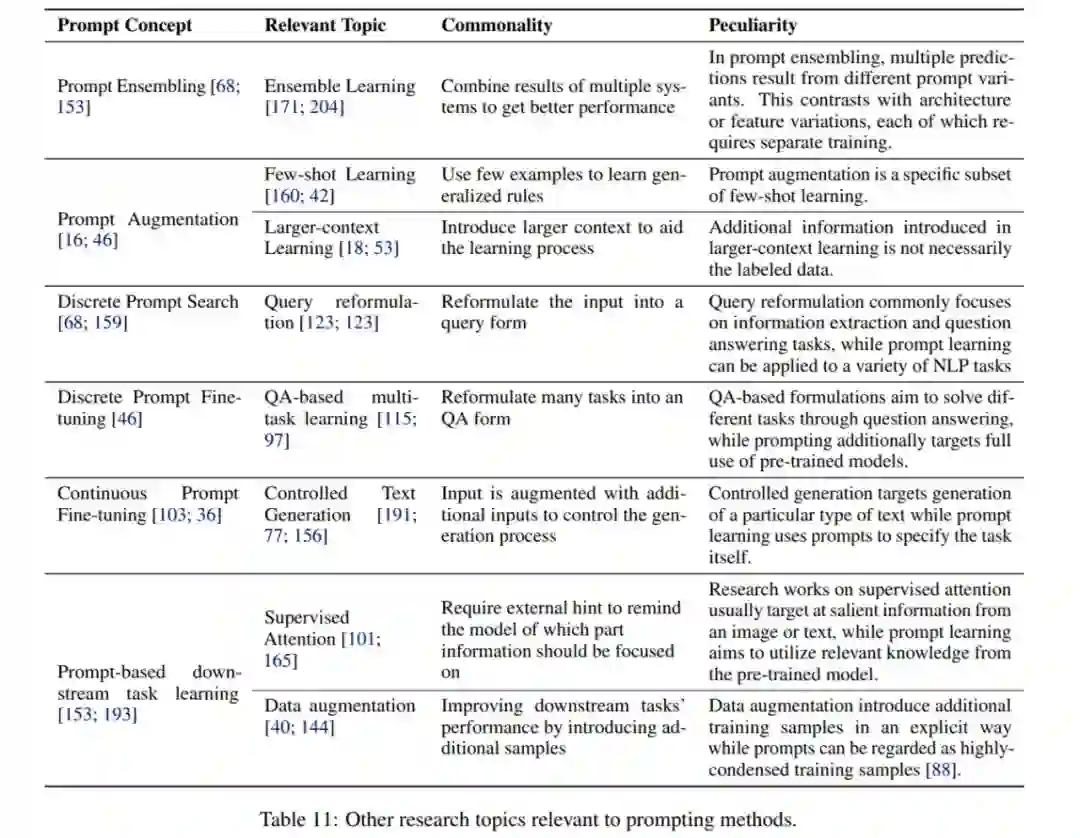 研究者总结了与 prompt 相关的主题,包括集成学习、少样本学习、更大规模上下文学习、查询重构、基于问答的多任务学习、可控生成、监督注意力和数据增强。
