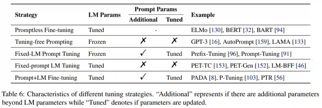 研究者基于底层语言模型的参数是否需要调整、是否有额外的 prompt 参数和这些额外的 prompt 参数是否需要调整这三个方面总结以下 5 种调整策略,如下表 6 所示,它们分别为: