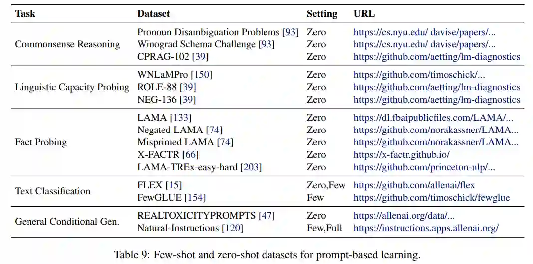研究者为不同的 prompt 应用收集了一些有用的资源,并且设计用于少样本和零样本学习的一些数据集如下表 9 所示: