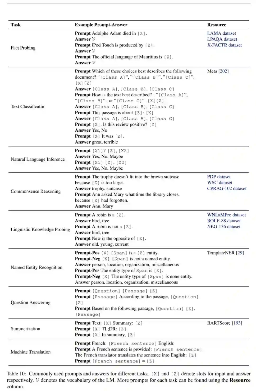 下表 10 展示了现有手动设计的常用 prompt,它们可以看作是适用于未来研究和应用的现成资源。
