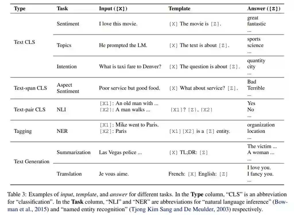 下表 3 为不同任务的输入、模板和 answer 示例: