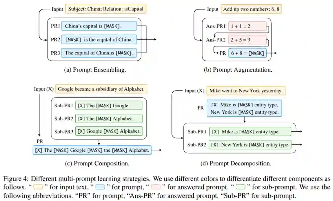 以上探讨的 prompt 工程方法主要集中于为输入构建单个 prompt。但是,大量的研究表明,多重 prompt 可以进一步提升 prompting 方法的效果,他们将这些方法称为 multi-prompt 学习方法。在实践中,有数种方法可以将单个 prompt 学习扩展至 multi-prompt,如下图 4 所示,这些方法包括如下: