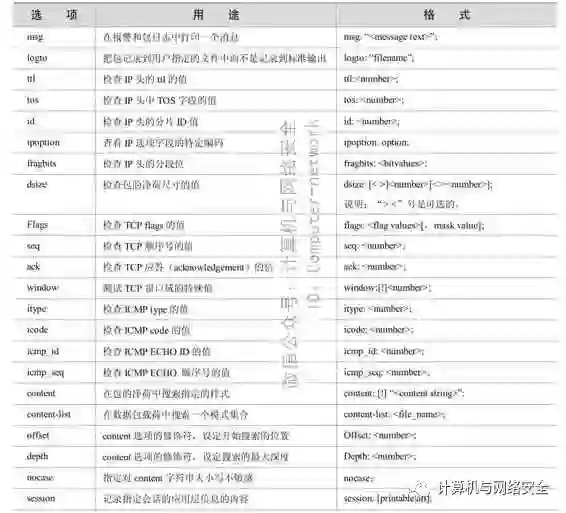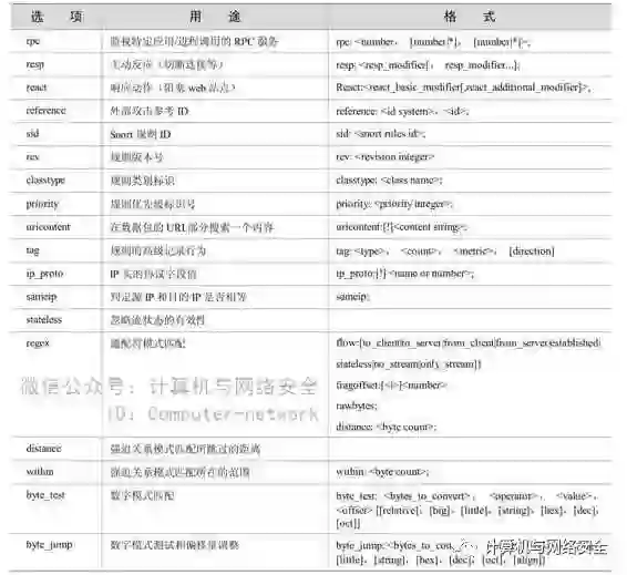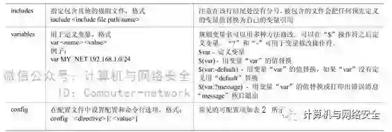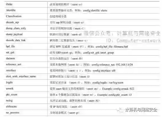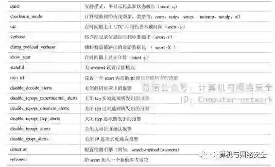 除了规则之外,Snort还支持一些配置和定义选项,常见的选项见表1。
