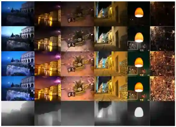 图3 低光照图像增强的对比实验,从上到下依次为原始图像、CVC方法的结果、LIME[4] 方法的结果,论文结果与论文生成的光照特征图