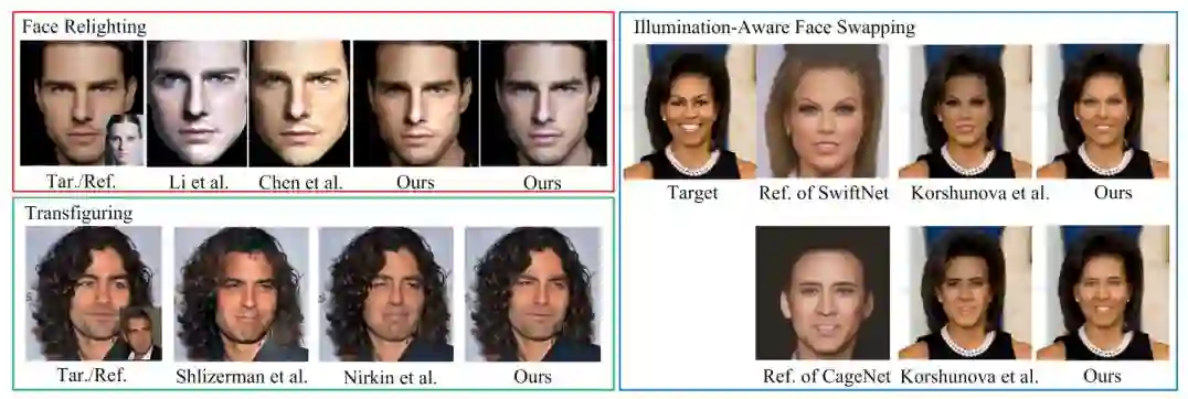 图2 人脸光照编辑的对比实验,其中红色框内为face relighting,绿色框内为transfiguring [2],蓝色框内为face swapping [3]